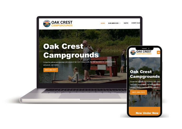 Clean, responsive website for Oak Crest Campground in West Liberty, OH designed to showcase amenities, drive bookings, and provide guests with easy access to maps, rates, and contact info.